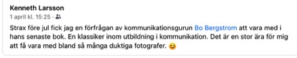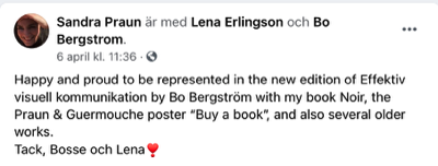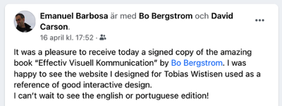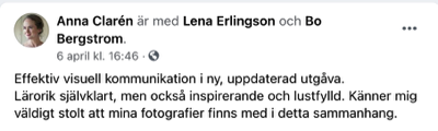 Boken tar upp så mycket mer än bara visuell kommunikation. Den handlar ju egentligen om all kommunikation. Kan man säga att den är ett talande bevis på vad den handlar om? Jag har även fått många goda skratt under läsningen. Jag gillar när du tar fram den historiska bakgrunden till olika före-teelser. Historien är framtidens spegel lär någon ha sagt. Min gamle kemilärare sa vid något tillfälle om kemi. ”Man kan inte kunna allt så det handlar om att veta var det står”. Jag kommer att ställa din bok i bokhyllan tillsammans med uppslagsböckerna. Jag kommer att se på kommunikation med andra ögon i fortsättningen.